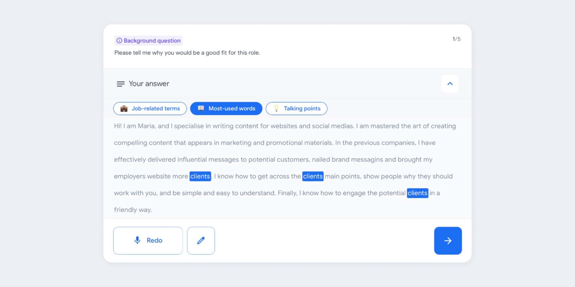 Google Interview Warmup records all your answers and assists you in analyzing what you've said. You can also listen to everything afterwards or re-record.