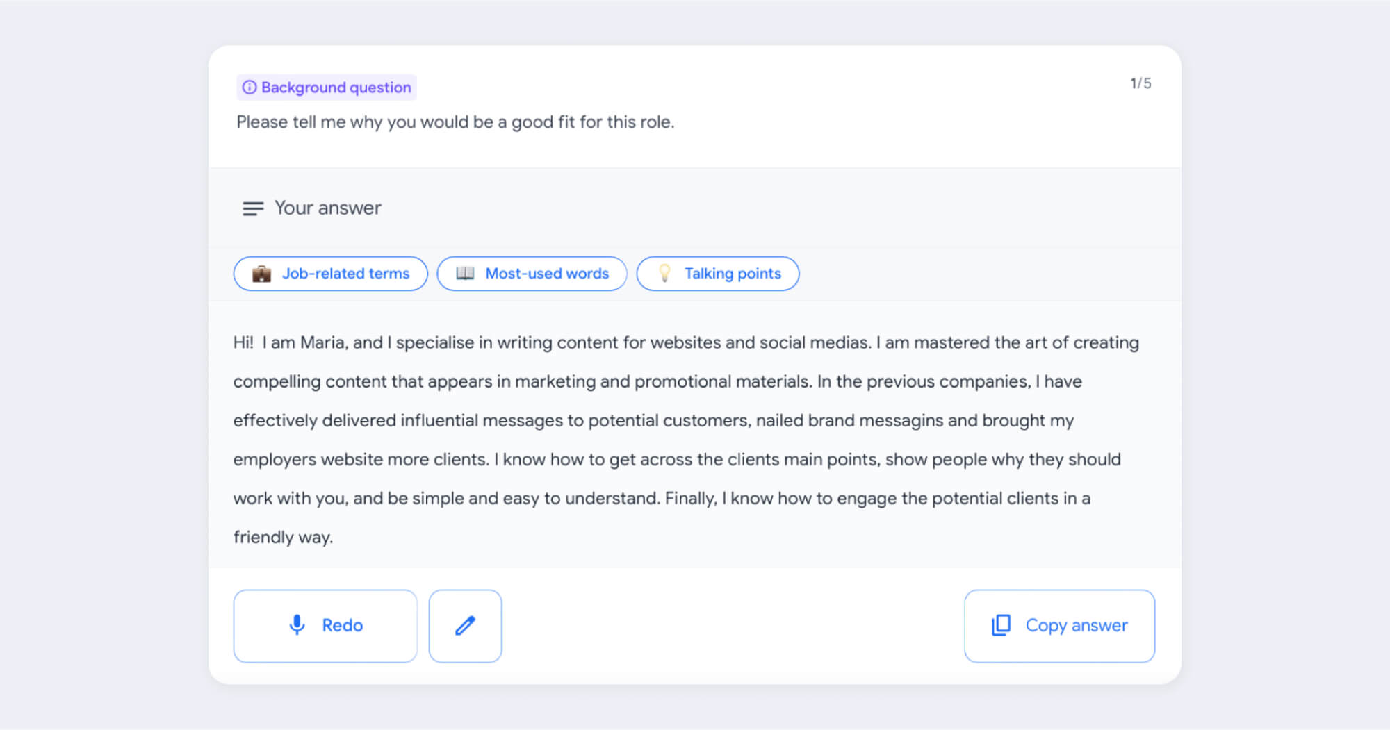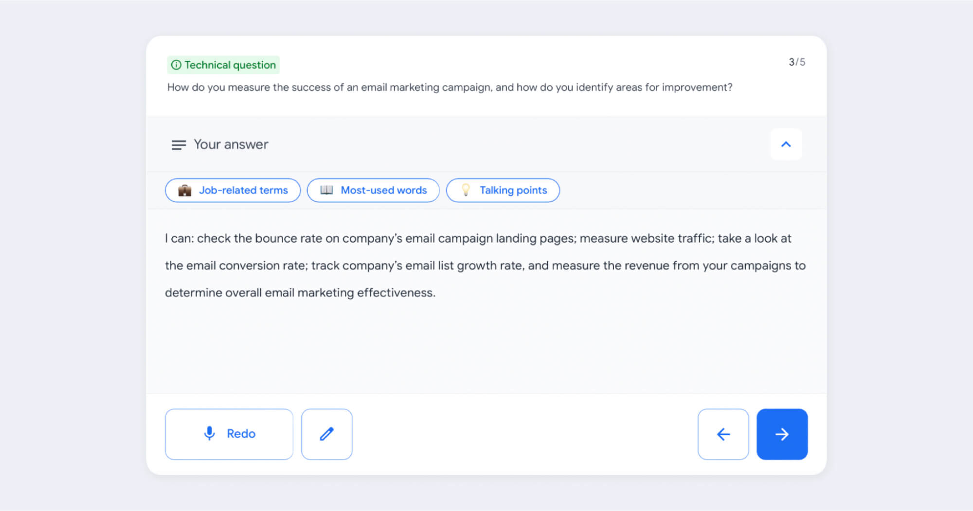 In 2022, Google released an AI-powered interview simulator that enables you to practice in the following areas: