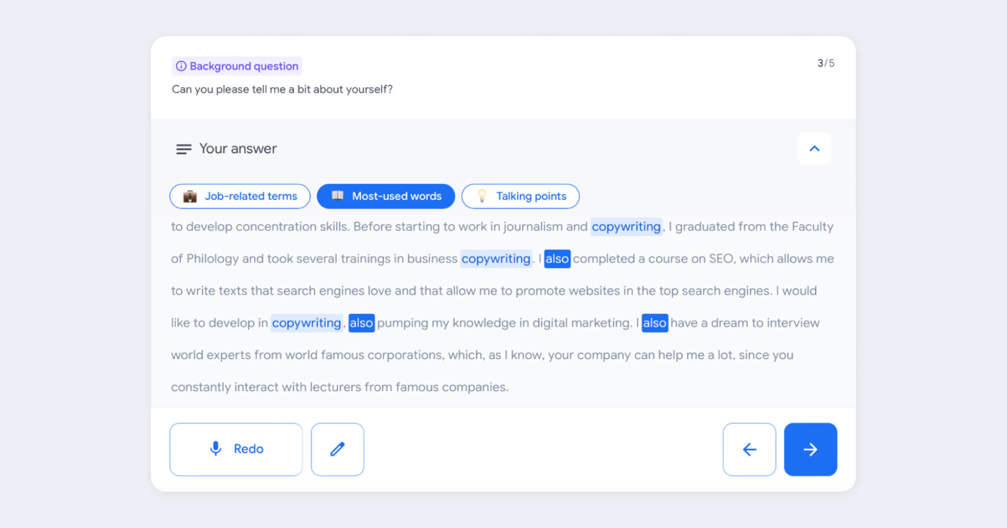 The interview simulator utilizes AI to pose traditional recruiter questions. After receiving the user's answer, Interview Warmup analyzes it and provides self-improvement recommendations. For instance, the interview simulator may advise eliminating superfluous words or elaborating on a point. It can also detect if you overuse certain words. You can respond to the recruiting questions both orally and in writing.