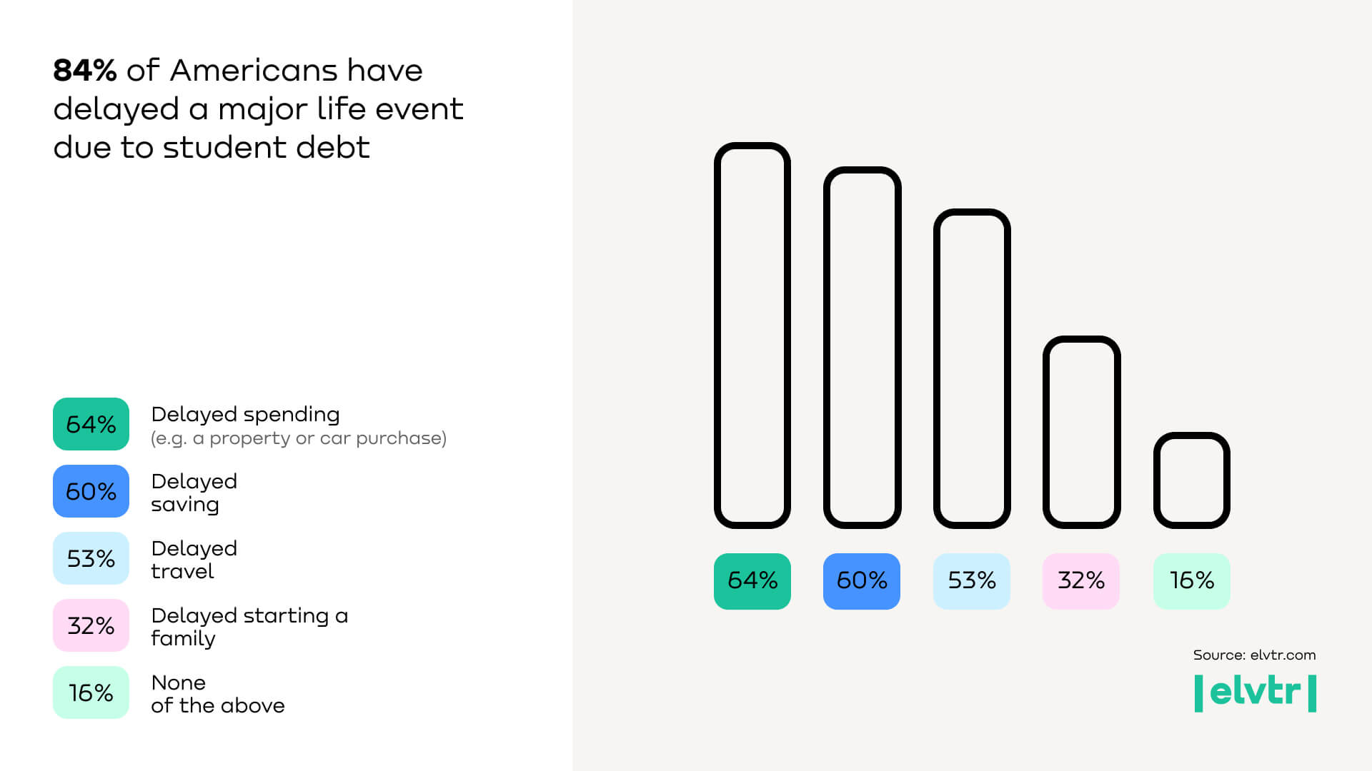 Just one in five Americans are fortunate enough to have been unaffected by the financial climate, with the vast majority having put an important life event on hold to keep up with student loan repayments. A third have delayed starting a family, more than half have shelved their plans to save or travel, and over 60% have put a major purchase on hold.