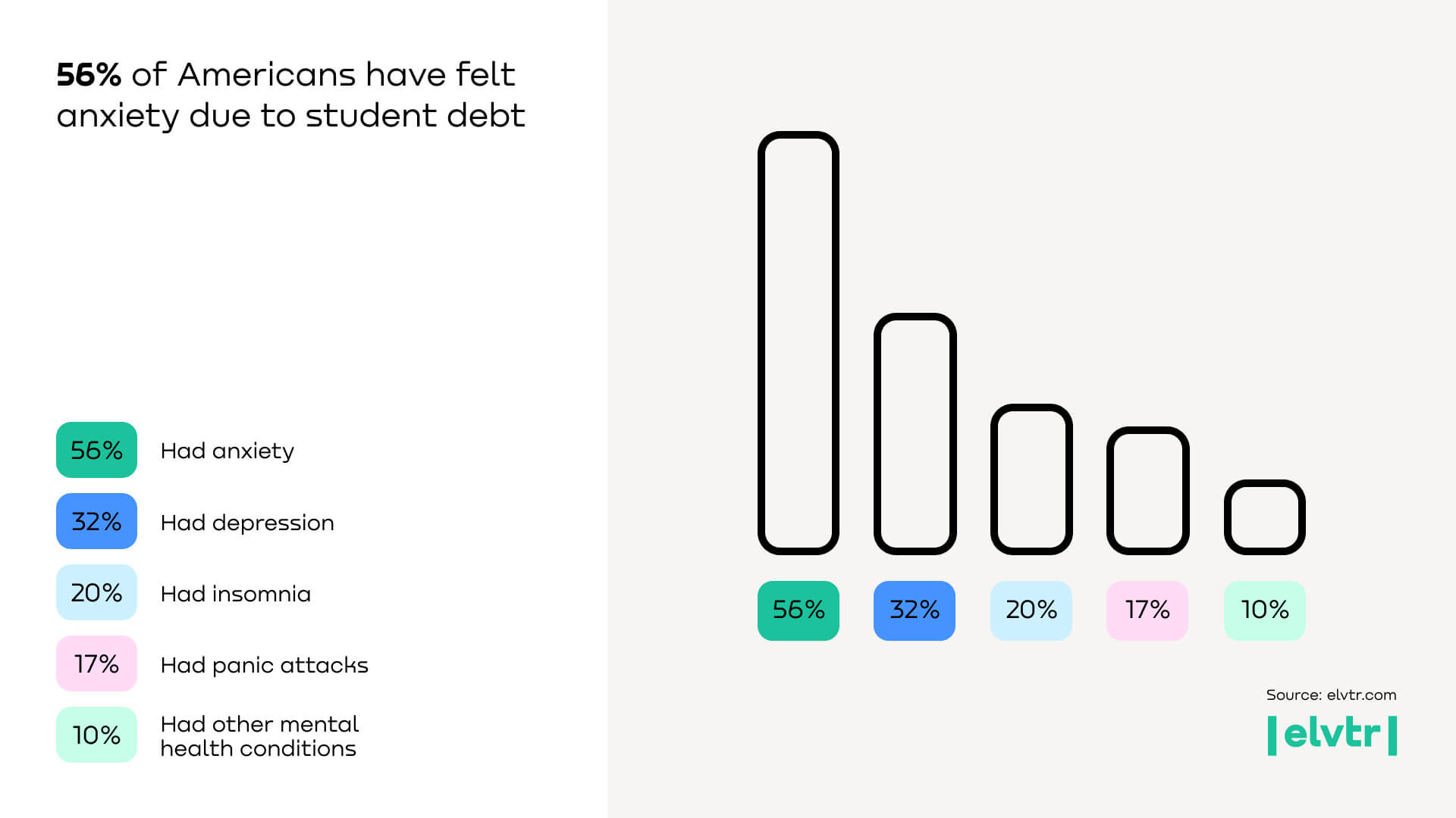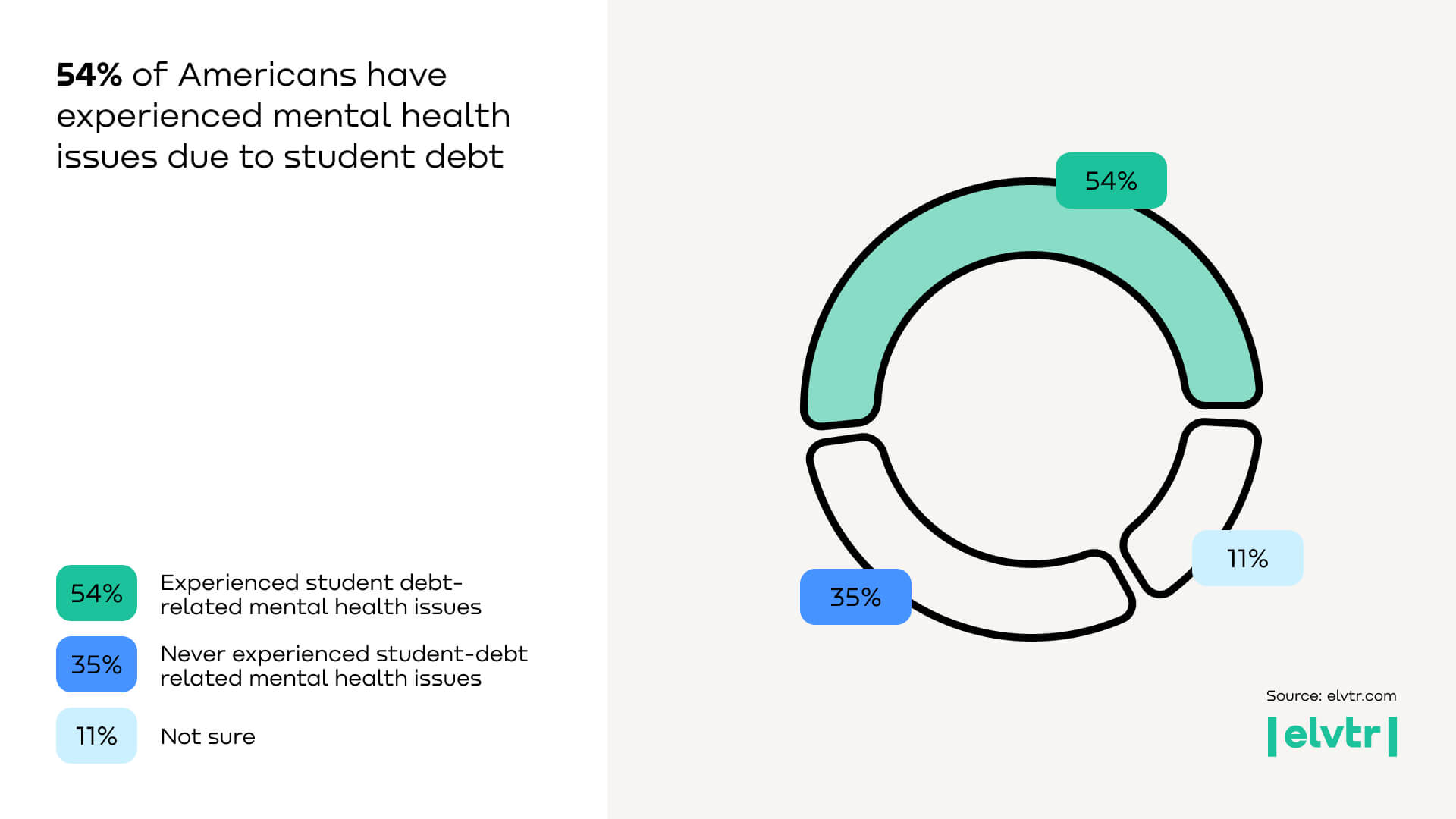 It isn’t just America’s pockets that are suffering. With many facing financial hardship like never before, the pressure of student loan repayments also impacts the nation’s mental wellbeing. ELVTR’s higher education study found that most (54%) have experienced mental health issues brought on by their student debt.