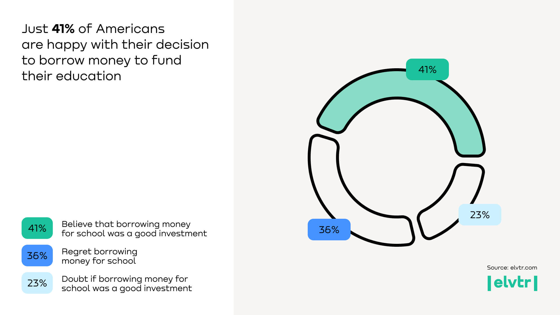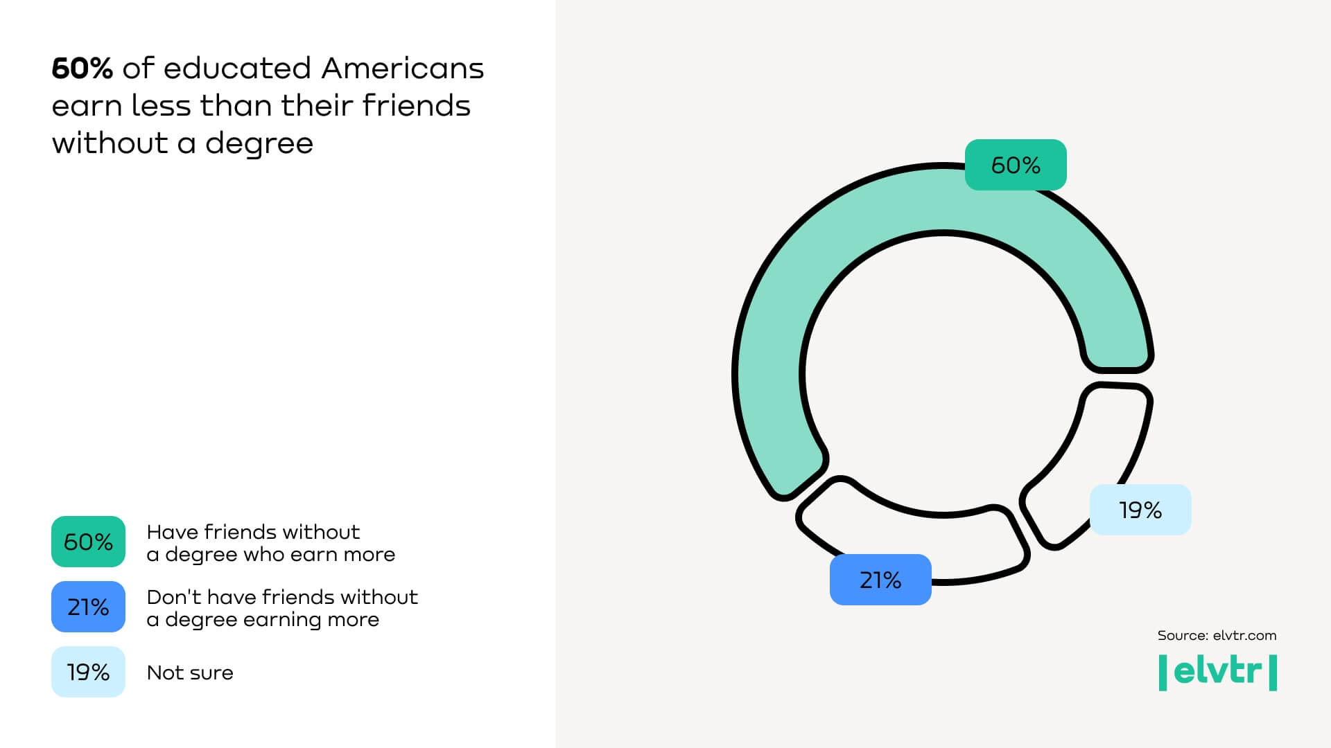 Earnings that fall short of expectations could be to blame. Despite costing tens of thousands of dollars, taking on student loan debt doesn’t guarantee graduates a well-paid role. In fact, ELVTR found that 60% of educated Americans earn less than some of their friends who have not acquired higher education.