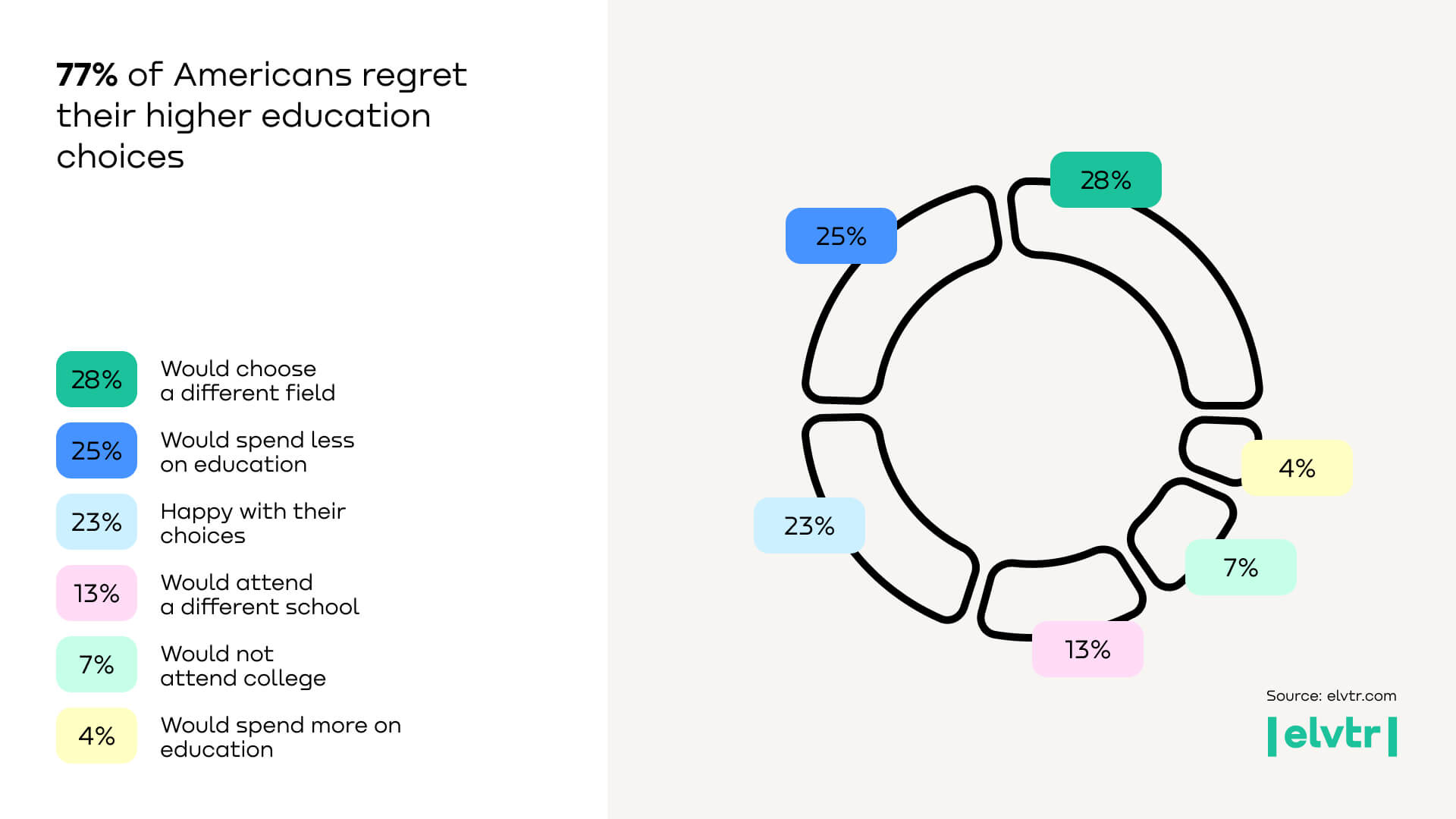 With this sense of regret often comes a longing to change the past. In fact, ELVTR research shows just 23% of Americans are happy with the college choices they made. With the opportunity to do things over, almost a third would choose a different field, while 32% would opt to attend a cheaper school or avoid higher education altogether, suggesting serious problems with the education system. Given the financial climate, just 4% would increase the amount they invested in their education.