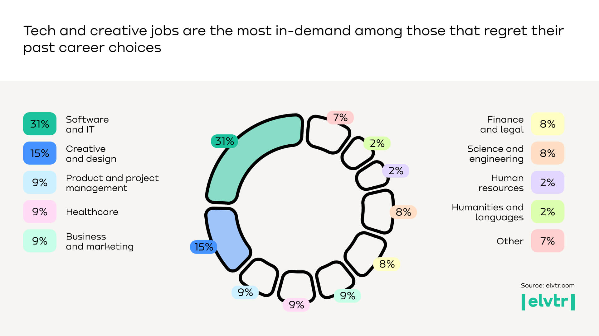 With software and IT jobs among the most in-demand and highest paid, this industry predictably ranks as the most highly desired among those that hold regrets over their education choices. In fact, nearly half of all graduates would choose a role in the IT or creative industries over their degree if given a chance to change.