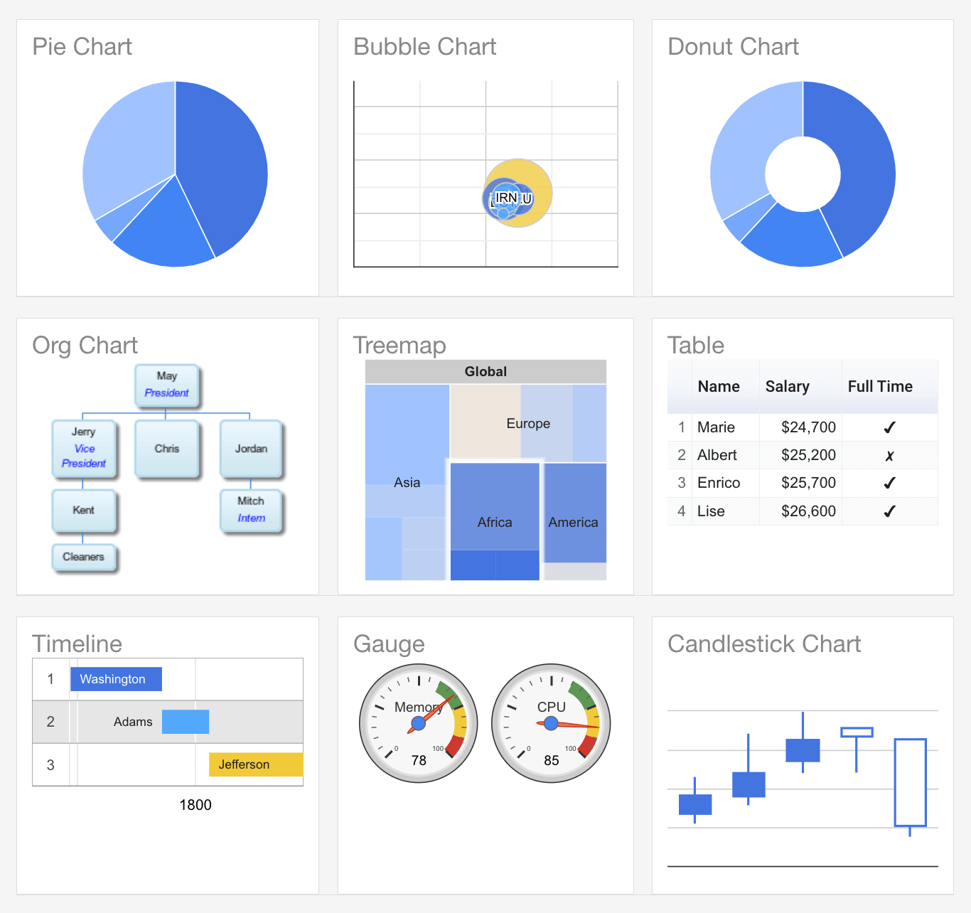 - Google Sheets integration. Google Charts seamlessly integrates with Google Sheets, allowing users to create charts directly from their spreadsheet data.