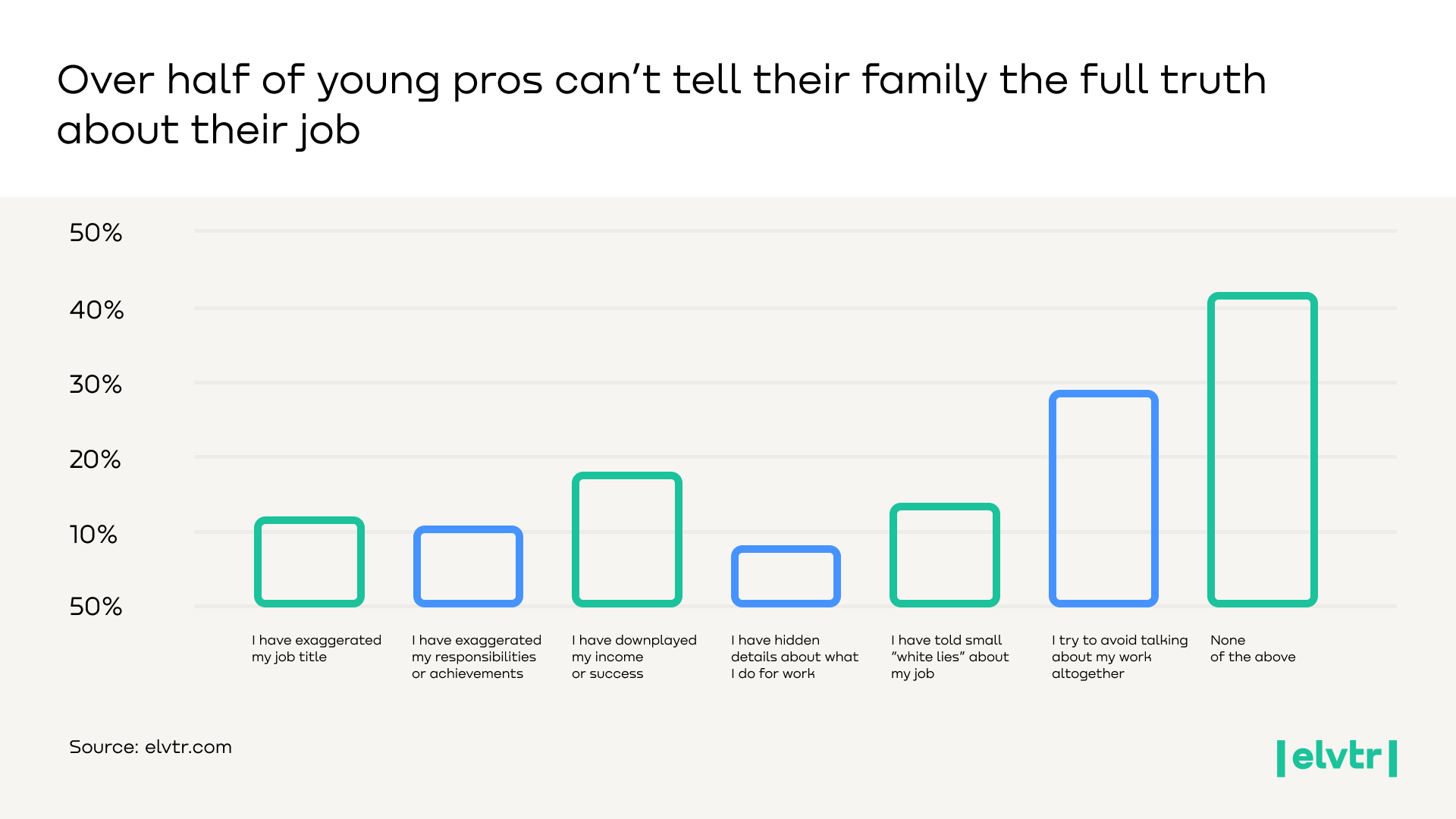 58% of young professionals have misrepresented their job in some way to their family, whether by exaggerating or downplaying details. Only 42% report being completely candid. Men and women are equally prone to these career fibs (approximately 60% of men vs. 56% of women), indicating this behavior transcends gender. Common tactics include avoiding the topic of work and telling small “white lies” about their job.