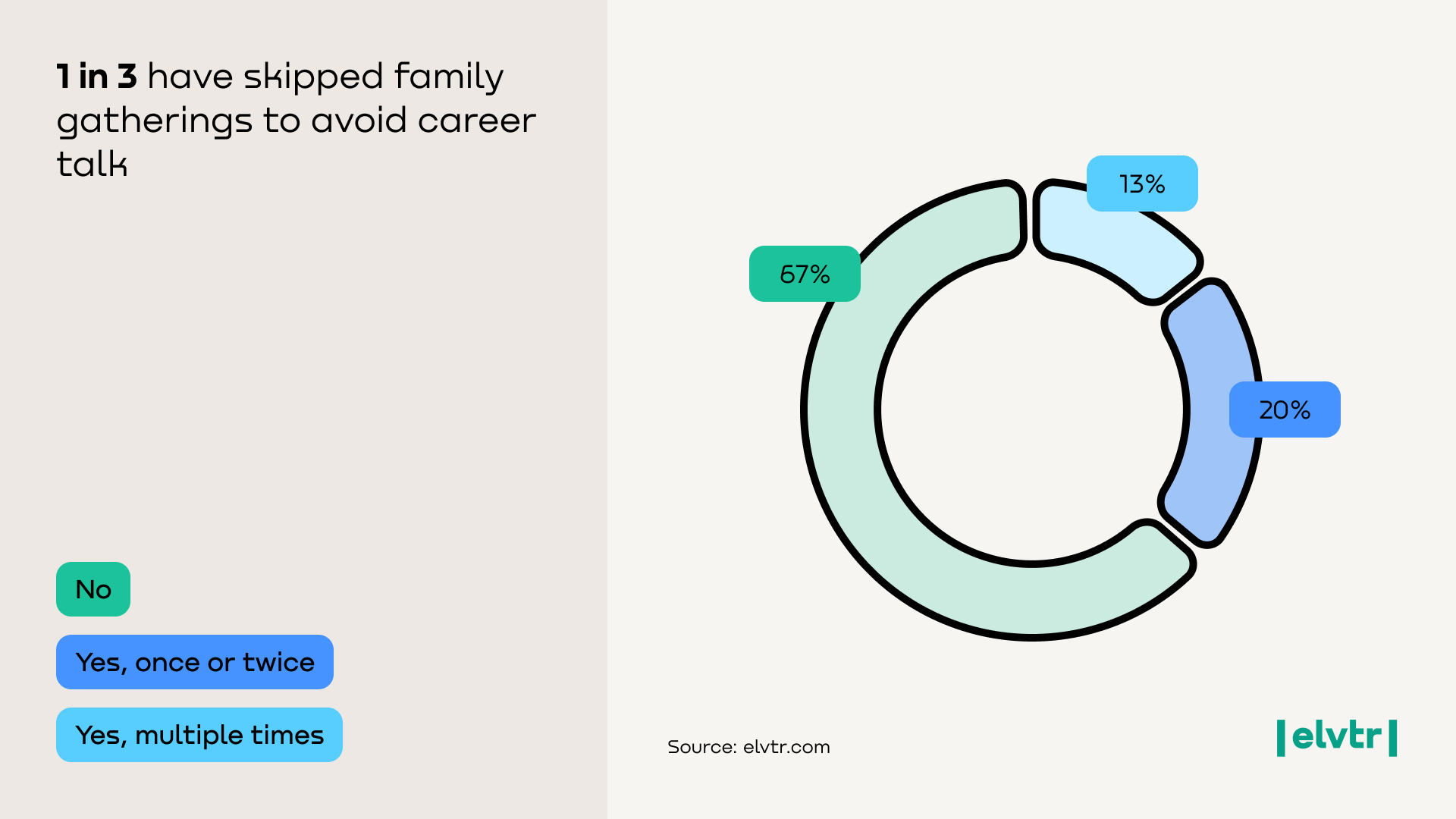 One in three respondents (33%) have avoided family gatherings at least once to dodge uncomfortable discussions about their career. In fact, 13% admit to doing this multiple times. This avoidance behavior is more prevalent among those feeling higher family scrutiny. Notably, second-generation Americans were directionally more likely to skip holiday events due to job concerns (about 41% have done so) compared to those from non-immigrant families (32%). This again underscores the intense pressure some immigrant parents may inadvertently place on career choices. (Overall, 67% of respondents say they’ve never skipped a family event for this reason.)