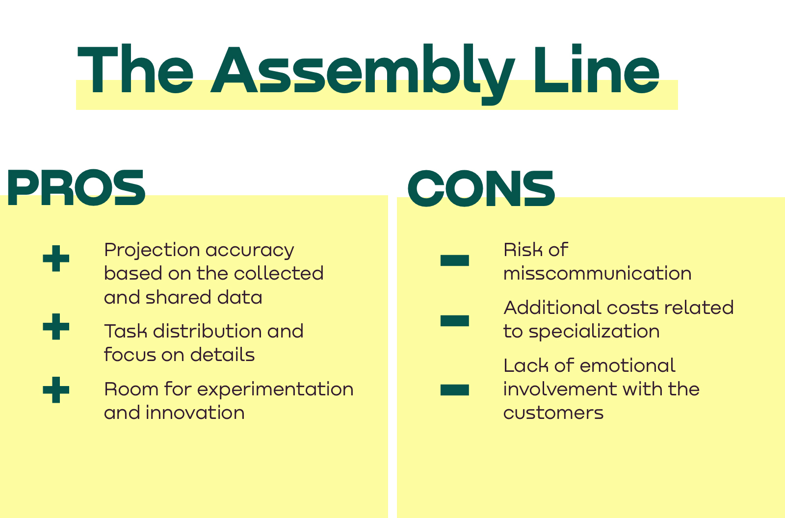 Opposite to “the island” model where each team member is equipped with A-Z sales techniques, the “assembly line” structure consists of individual specialists that operate linearly. It resembles and derives its name from the factory conveyor where the raw material travels from station to station and gradually turns to an end product.