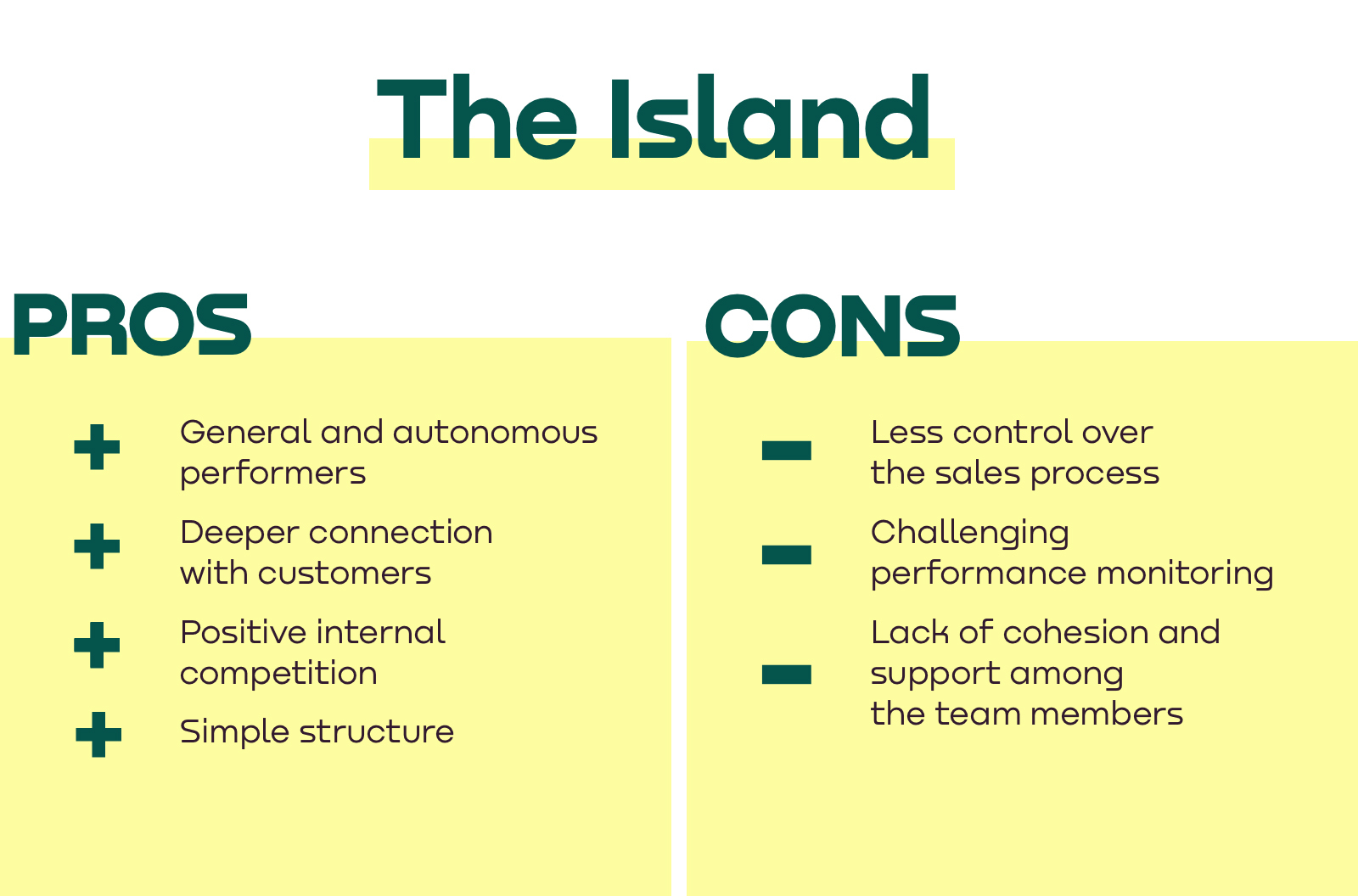 It’s your responsibility to come up with an adequate sales team model and leverage it in the process of building and managing a high-performing team. Start by understanding the three most well-known and in practice mostly applied sales models: the island, the assembly line, and the pod.