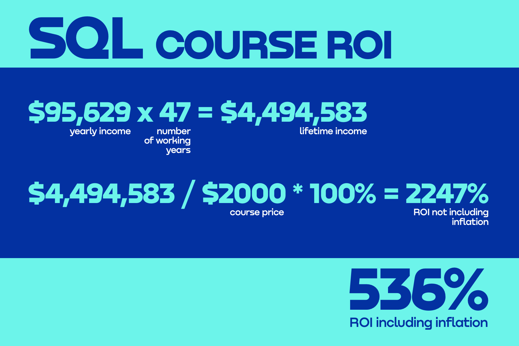 On average, an online IT course, say SQL, will set you back Two Grand. On paper, this seems like a great deal of money, but we must look at potential income. For example, the mean income for a SQL Admin is $95,629 per year. A career that's great for data-heads and will most likely be around tomorrow, according to our resident SQL Teacher, Adam Gorski.