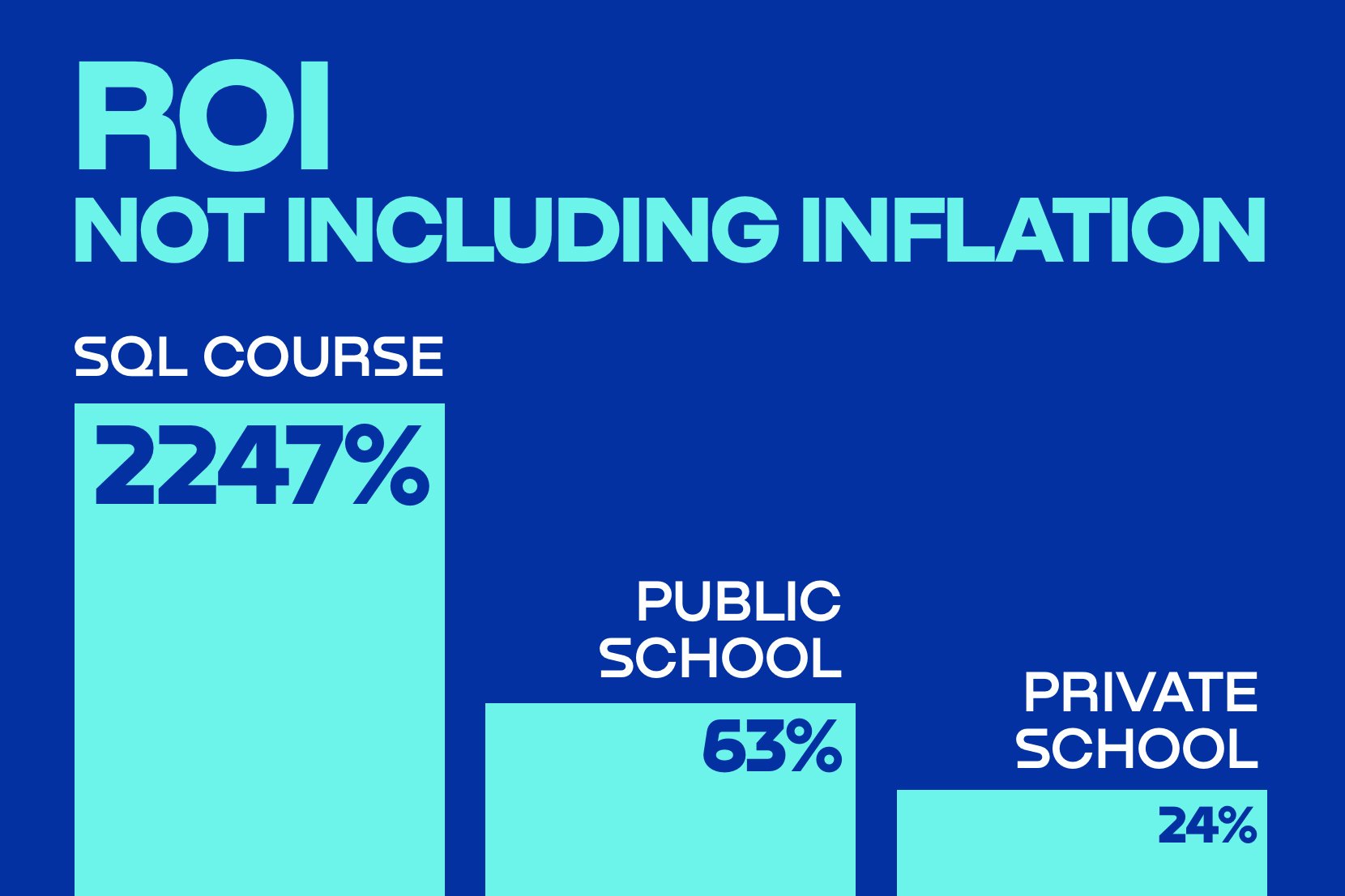 And, if you were to get our hypothetical SQL Admin position, the ratio falls to 24%. Still in the positive, but not the windfall that a 2000% return yields. Attending a private for-profit school, an Ivy League education lowers the return ever more so.