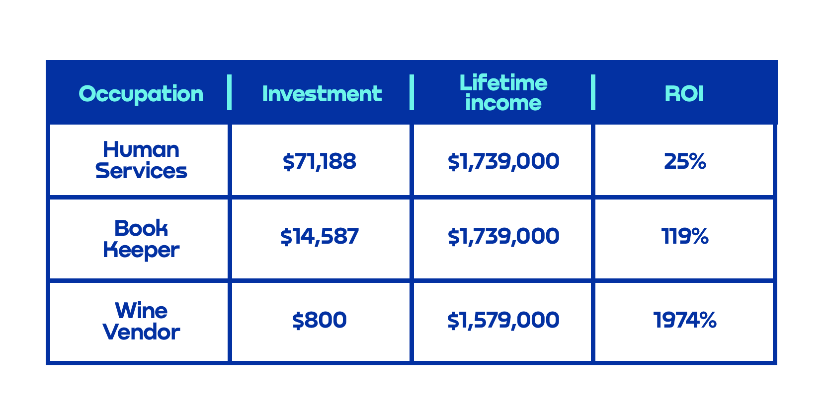 However, it’s good news for comparing ROI on educational investment. Due to the high demand for degrees or continuing education in the job market, we can compare two roles with arguably similar skillsets. For example, a bachelor's degree is required to work in Human Services — a laudable career, without a doubt. And, an associate’s degree is required to work as a Book Keeper, those busy-bees that keep business honest.